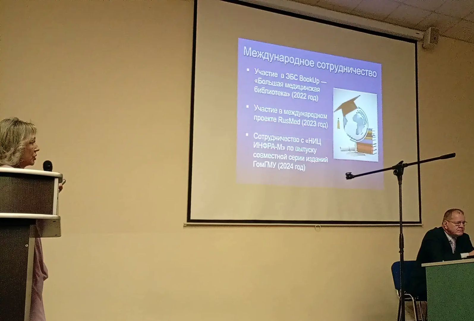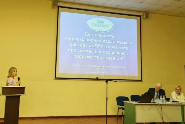 С докладом «Деятельность информационно-издательского центра ГомГМУ в контексте программы инновационного содружества стран СНГ» выступила начальник центра Гарельская Екатерина Владимировна, которая презентовала коллегам зарубежные информационные проекты ГомГМУ и поделилась опытом совместного выпуска учебных изданий университета в рамках совместного проекта с Научно-издательским центром «ИНФРА-М».